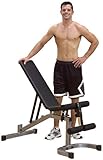 Powerline Flat Incline Decline Bench. Allows proper form and positioning for incline and shoulder press exercises. Improved design features quick and secure 6 position ladder style back pad adjustment. 8 position seat pad adjustment for bent knee sit ups and ab crunches.The Powerline Flat Incline Decline Bench provides support for decline, incline, and flat bench exercises ranging from sit-ups to shoulder presses. With three-position seat pad adjustment and a leg hold-down, the bench allows you
