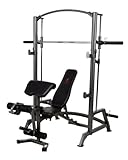 The Marcy Diamond Elite SM1050 Smith Cage System by Impex offers you a complete array of exercises to work all major muscle groups, tone, burn calories, and increase strength and stamina. The convenient two piece bench and cage design allows you to perform squats and lunges and the bench can be used with the Smith rack or as a separate workout bench for dumbbell exercises. The Smith guide rods feature safety stops, allowing you to maximize your weight load while reducing your risk of injury.